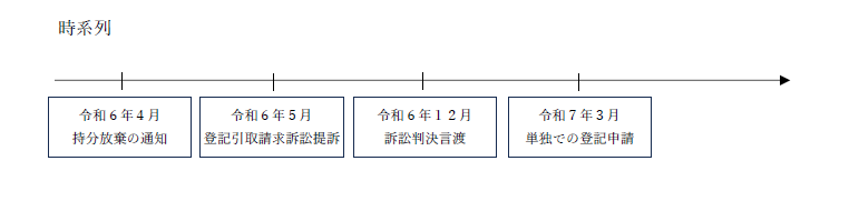 ・持分の放棄を行った者が令和6年5月に登記引取請求訴訟を提訴した。