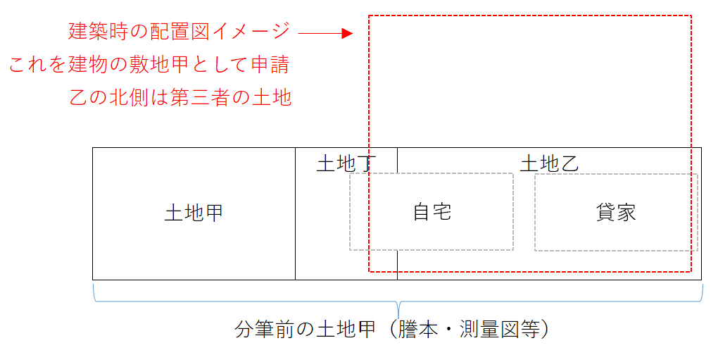 (5)甲を土地丁に分筆(おそらく自宅の越境)したが所有権は移動なし