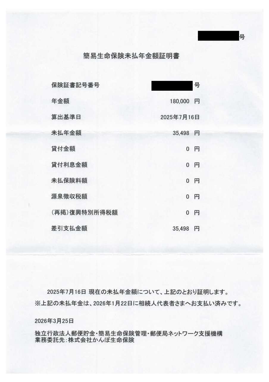 令和8年1月22日に相続人の口座に35,498円の入金