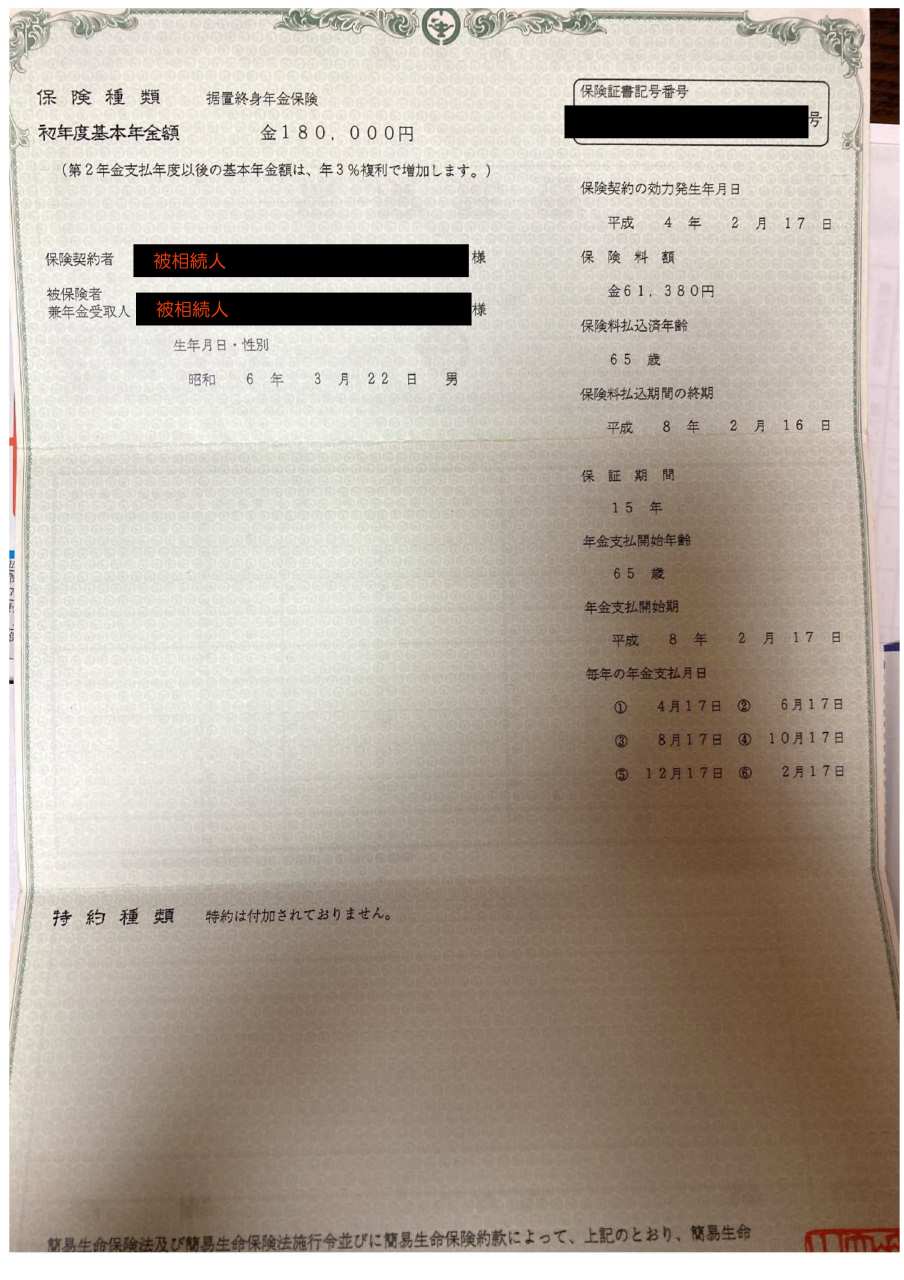 保険契約の効力発生日:平成4年2月17日(被相続人の年齢60歳)