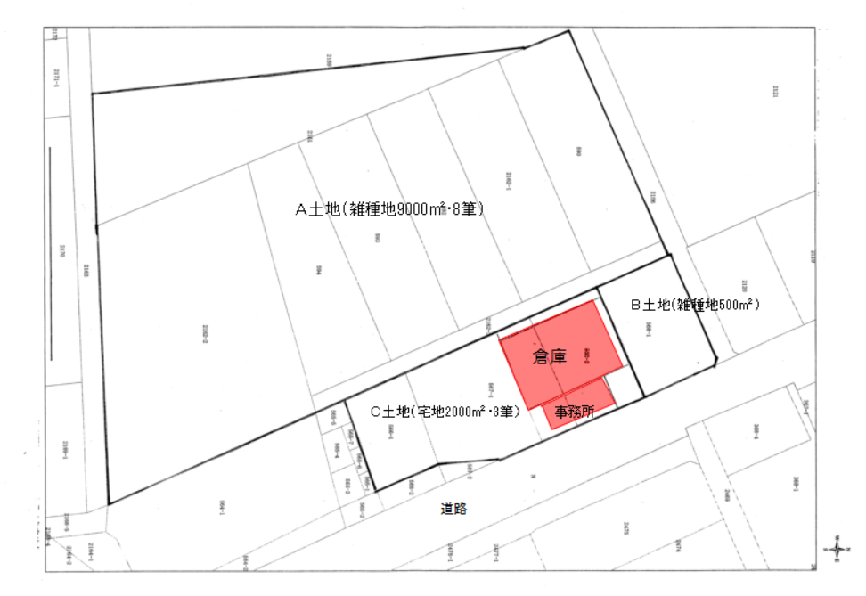 ③C土地(宅地2000㎡・3筆)は法人X所有の、倉庫及び事務所の敷地として利用。