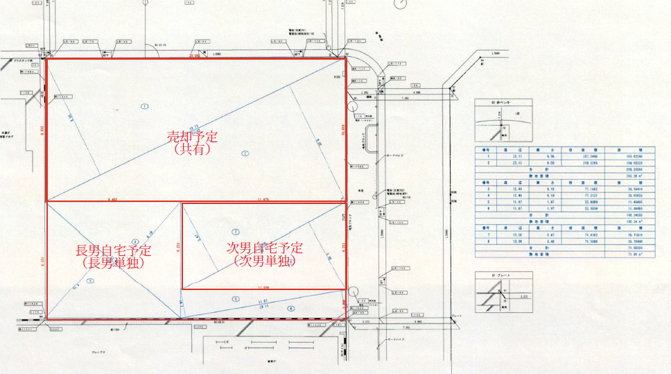分筆予定の3筆について、既に不動産の売買契約と長男次男の新築請負契約は締結済み。