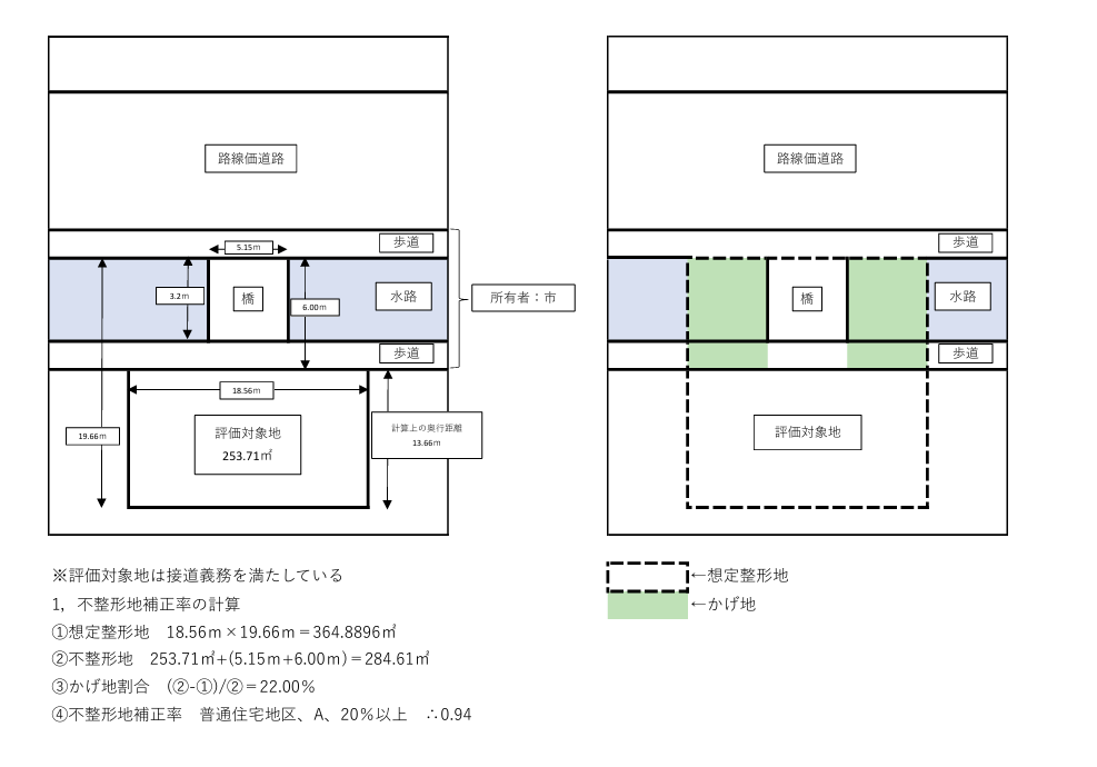 ②不整形地補正率のかげ地の部分を添付資料のかげ地部分をもとに計算。