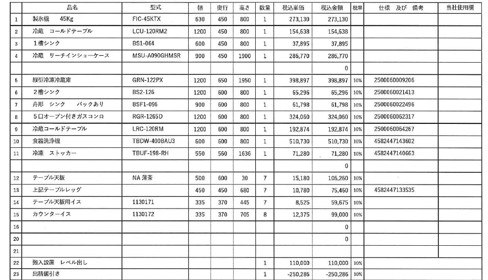 飲食店舗開店に伴い、厨房機器を購入。