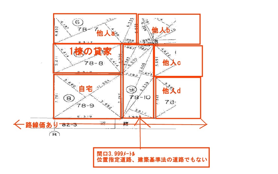 無道路地にはならないとは思うが自宅(78-9)と貸家(78-8)と一体評価して按分?