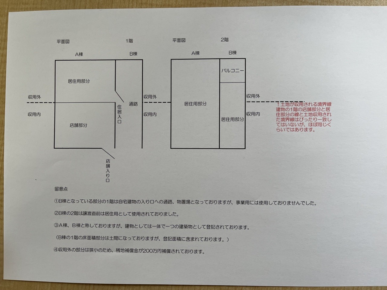 収用の線は、店舗と住居の壁のうち、住居側壁の線を通っております。