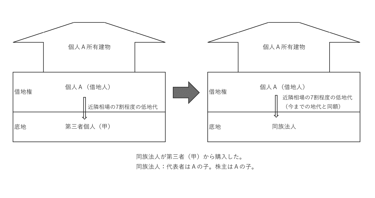 初代(父)が借りている土地の底地を上記法人が購入したが、