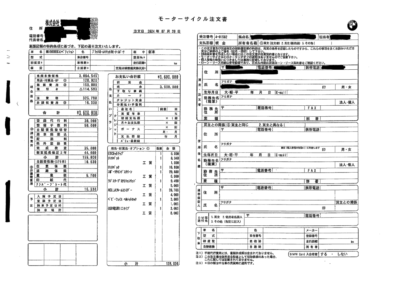 ※注文書の左上のマスキングは、バイク販売会社の名称、住所、電話番号等が書かれており、