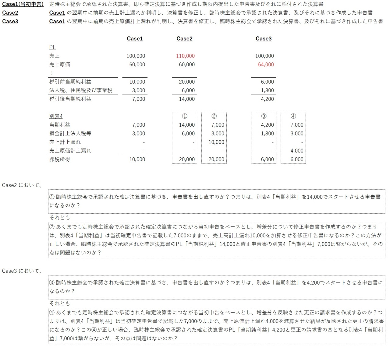 Case3は売上原価の計上漏れだけ取り込んだ"やり直し決算書"を臨時株主総会で承認し、