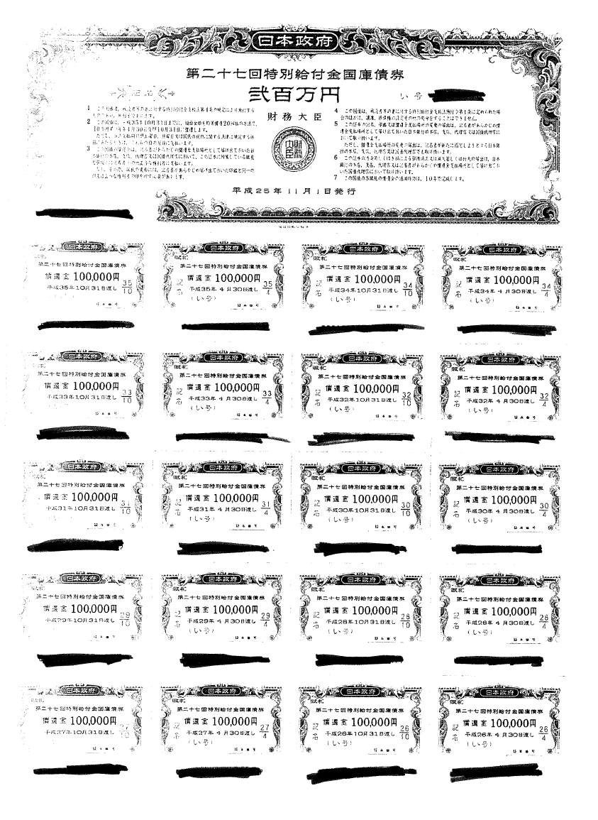 相続人宅から「第二十七回特別給付金国庫債券 二百万円」
